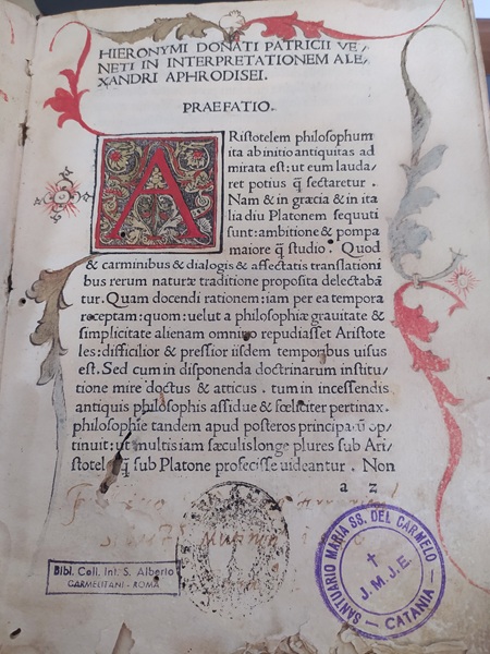 The incunabulum – from the Latin incunabulum, meaning in the cradle, to indicate the first books printed in the 15th century – does not yet feature the typical title page that would only appear from 1500 onwards, but an incipit page, very similar to those found in contemporary manuscripts, with a rubricated initial letter, larger in size, on a floral background, executed using the woodcut technique [photo 1]. Accompanying the text is a hand-drawn plant frieze that unfolds on three sides of the page, except for the bottom margin. The three stamps can be seen, including that of the Carmelite Library can be seen at the bottom [photo 1].