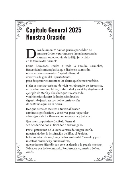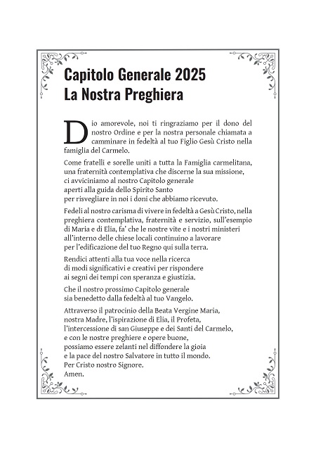 Nel frattempo, vi invitiamo a unirvi ai membri del Capitolo Generale nella preghiera. Potete scaricare la Preghiera del Capitolo in inglese, spagnolo o italiano dal sito web dell'OCARM (ocarm.org).