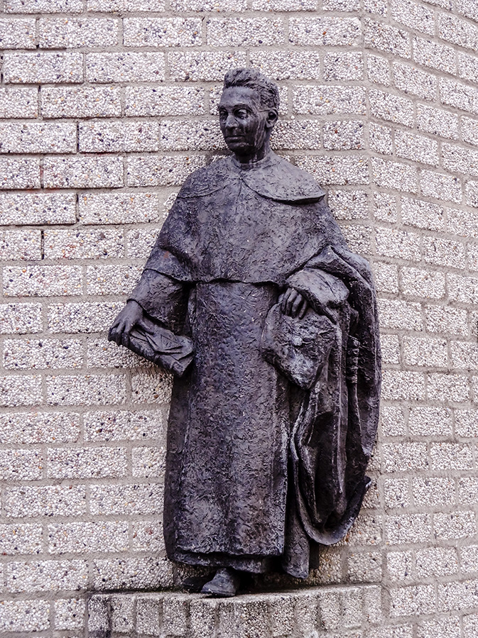 *Estatua de Tito Brandsma creada por Gerard Mathot en la calle Thomas van Aquinostraat junto al muro de uno de los edificios de la Universidad de Radboud en Nimega, Países Bajos.