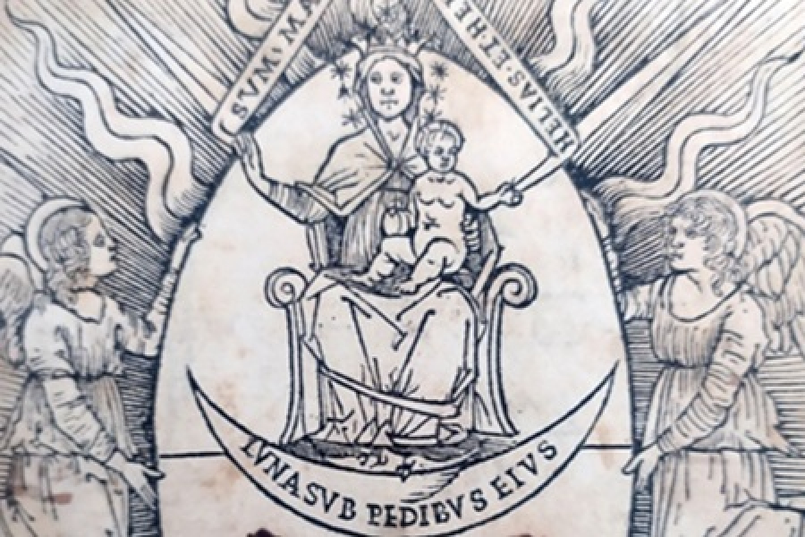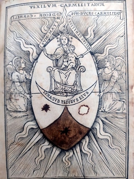 Allo stesso raffinato xilografo si deve, con ogni probabilità, anche l’immagine che precede la carta incipitaria, ove è rappresentato il Vexilum Carmelitarum, sorretto da due angeli, con all’interno, in posizione frontale, l’effigie della Vergine del Monte Carmelo, di squisita fattura [foto 2].