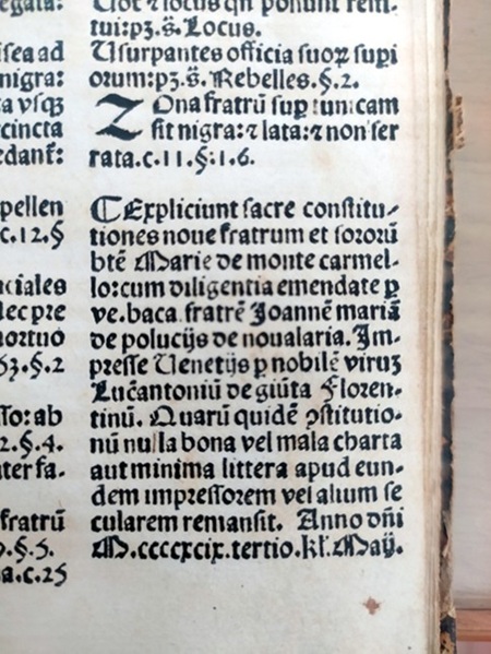 Presso la Biblioteca Generale Carmelitana è conservato un prezioso incunabolo che contiene le Constitutiones Fratrum Ordinis Carmelitarum, curate dal carmelitano Giovanni Maria Polucci e stampate a Venezia il 29 aprile del 1499, dal noto tipografo Lucantonio Giunta.