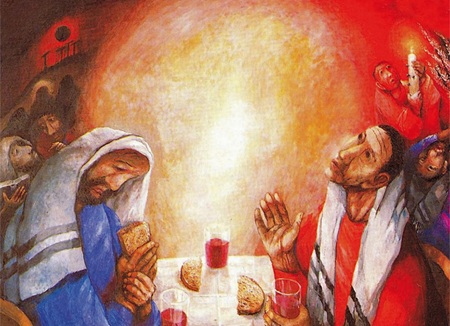 A tavola Gesù prende il pane, dice la tradizionale benedizione ebraica (come la preghiera che facciamo noi prima dei pasti) e spezza il pane, e gli occhi di questi discepoli fedeli, ma ciechi, si aprono e lo riconoscono.